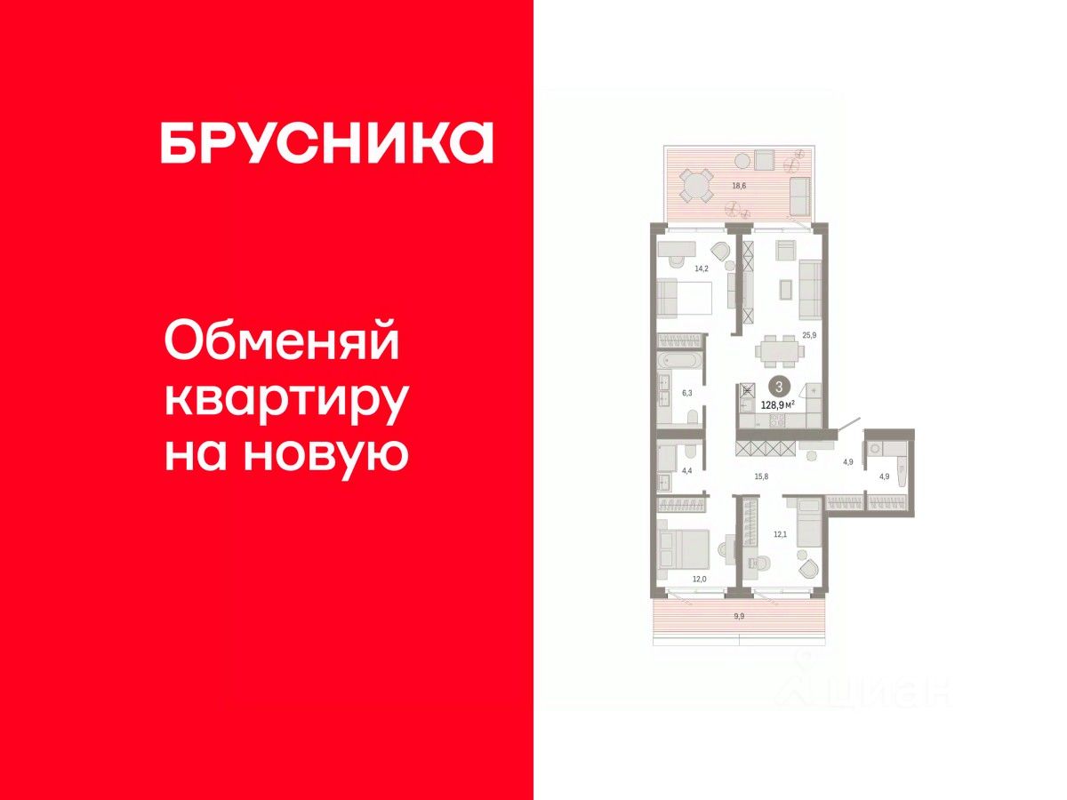 Просторная трехкомнатная квартира с предчистовой отделкой в ЖК "Город-на-озере" на 2 этаже. Общая площадь: 128.92 кв.м. Высота потолков 3.0 м.