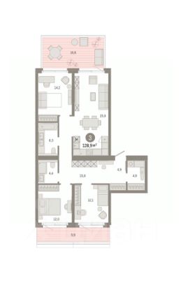 Квартира с кухней-гостиной и тремя спальнями в проекте Город-на-озере. Особенности планировки: вид во двор, второй санузел, потолки 3 м и выше, разнесённые спальни, свободная планировка, терраса, терраса на крыше.