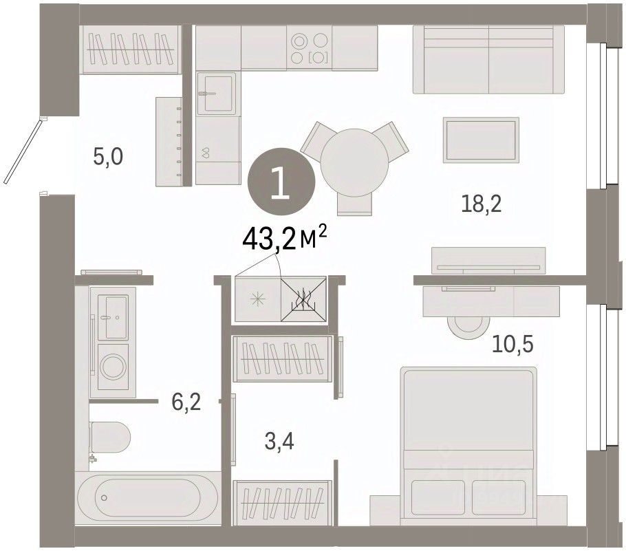 Квартира с кухней-гостиной и одной спальней в проекте Город-на-озере. Особенности планировки: предчистовая отделка.