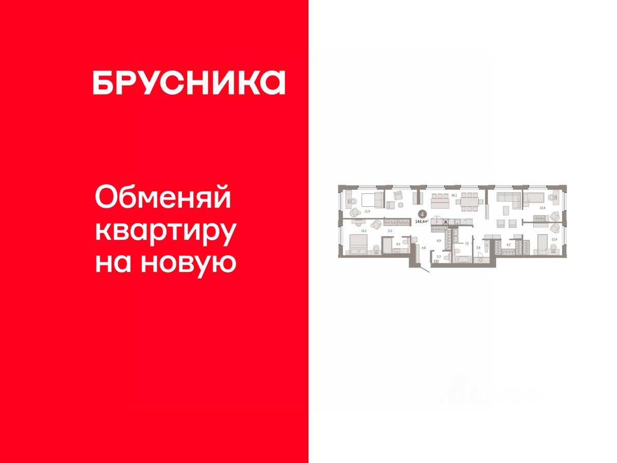 Квартира с кухней-гостиной и четырьмя спальнями в проекте Город-на-озере. Особенности планировки: предчистовая отделка, рабочий кабинет, разнесённые спальни.