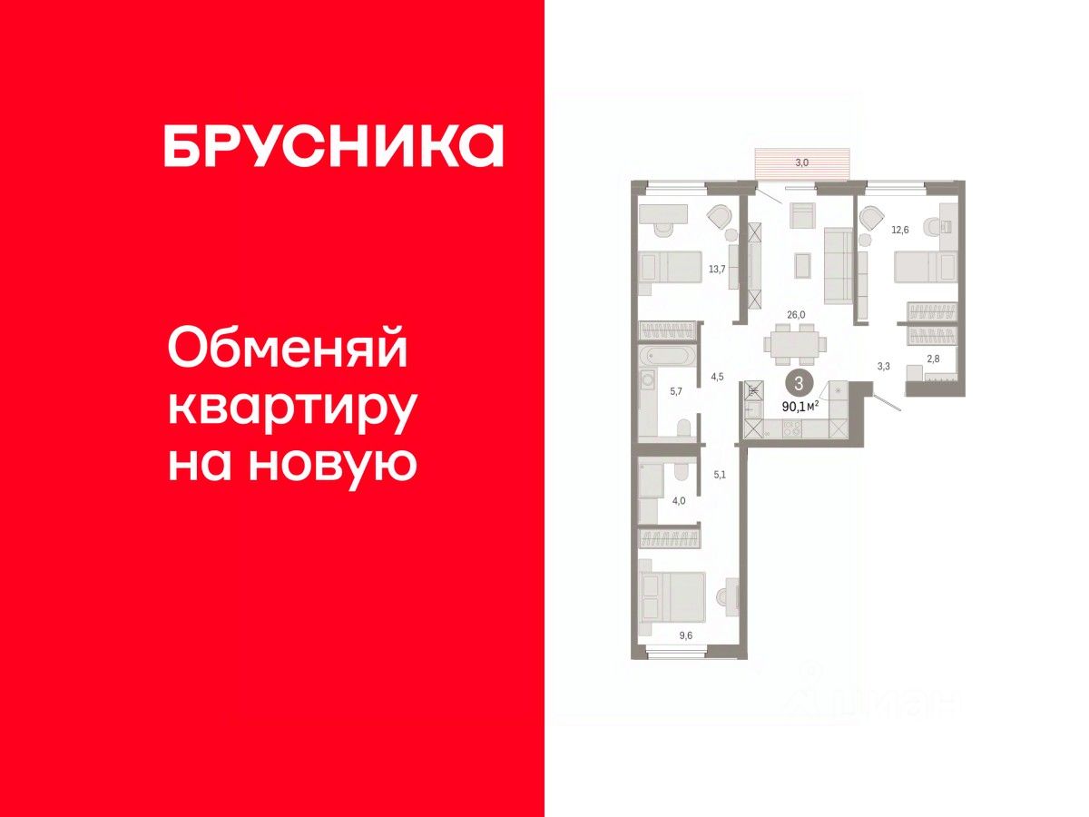 Квартира с кухней-гостиной и тремя спальнями в проекте Город-на-озере. Особенности планировки: балкон, вид во двор, второй санузел, гардеробная, мастер-спальня, окна на две стороны, потолки 3 м и выше, предчистовая отделка, разнесённые спальни.