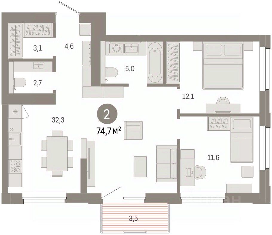 Квартира с кухней-гостиной и двумя спальнями в проекте Город-на-озере. Особенности планировки: балкон, новые лоты, предчистовая отделка, разнесённые спальни.