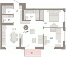 2-комн. квартира с предчистовой отделкой в ЖК "Город-на-озере" на 11 этаже. Общая площадь: 74.73 кв.м., жилая: 23.7 кв.м., площадь просторной кухни-гостиной: 32.3 кв.м. Квартира угловая, идеально подойдет любителям тишины и панорамных видов. В квартире один балкон, один совмещенный и один раздельный санузел. Высота потолков 3.0 м.