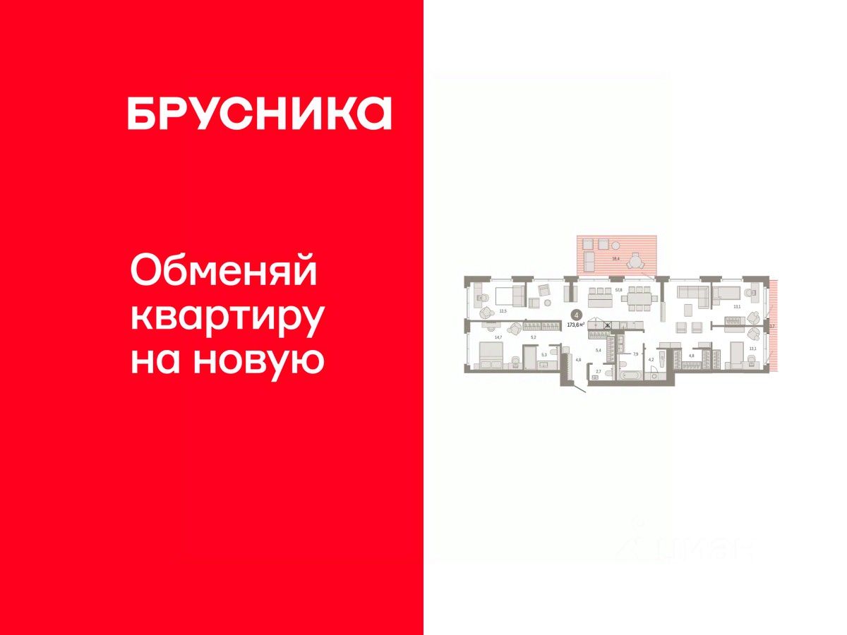 Просторная 4-комн. квартира с предчистовой отделкой в ЖК "Город-на-озере" на 2 этаже. Общая площадь: 173.63 кв.м. Высота потолков 3.0 м.