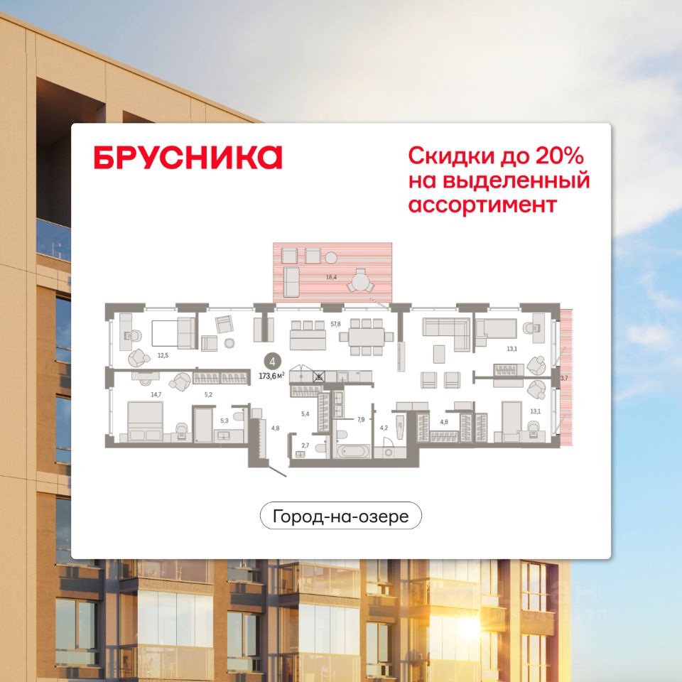 Продается 4-комн. квартира с предчистовой отделкой в ЖК "Город-на-озере" на 2 этаже. Общая площадь: 173.63 кв.м. Высота потолков 3.0 м.