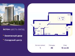Однокомнатная квартира с предчистовой отделкой в ЖК "Астон. Шесть Звезд" на 16 этаже. Общая площадь: 48 кв.м., жилая: 17.75 кв.м., площадь просторной кухни-столовой: 17.25 кв.м. Все окна выходят на одну сторону. В квартире одна лоджия, один совмещенный санузел. Высота потолков 2.65 м.