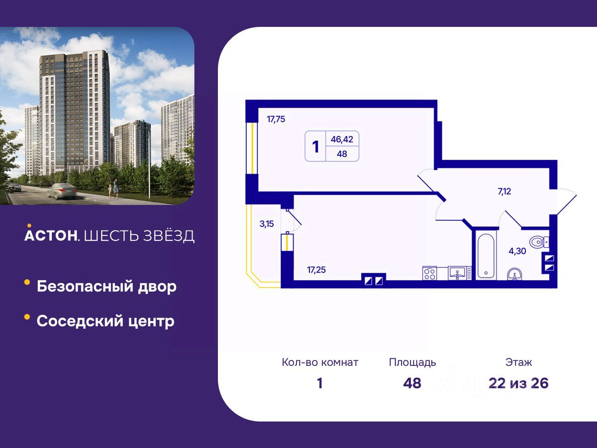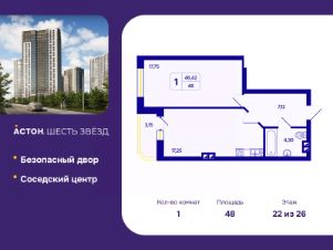 Продается 1-комн. квартира с предчистовой отделкой в ЖК "Астон. Шесть Звезд" на 22 этаже. Общая площадь: 48 кв.м., жилая: 17.75 кв.м., площадь просторной кухни-столовой: 17.25 кв.м. Все окна выходят на одну сторону. В квартире одна лоджия, один совмещенный санузел. Высота потолков 2.65 м.