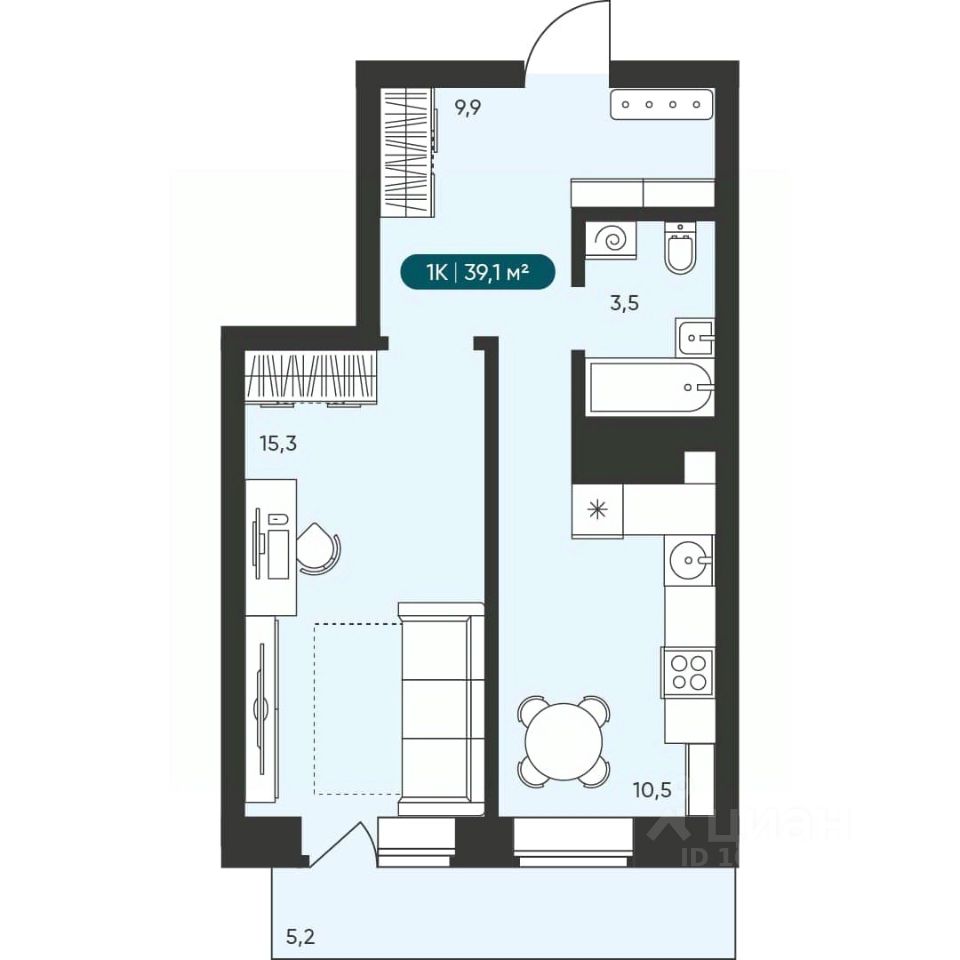 Общая площадь39,1 м²