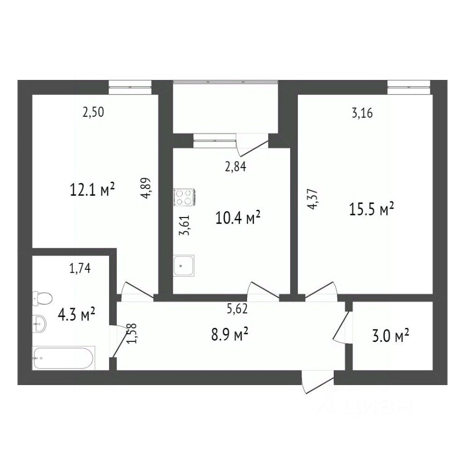 Общая площадь 54,6 кв.м. Квартира светлая и просторная. Планировка функциональна и включает изолированные комнаты, просторную гардеробную и раздельный санузел.