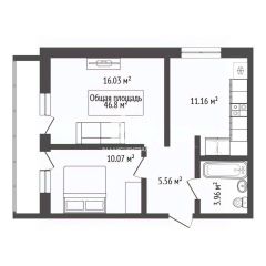Общая площадь квартиры составляет 46,8 кв. м, из которых 26,1 кв. м — жилая площадь, а 11,2 кв. м — кухня.