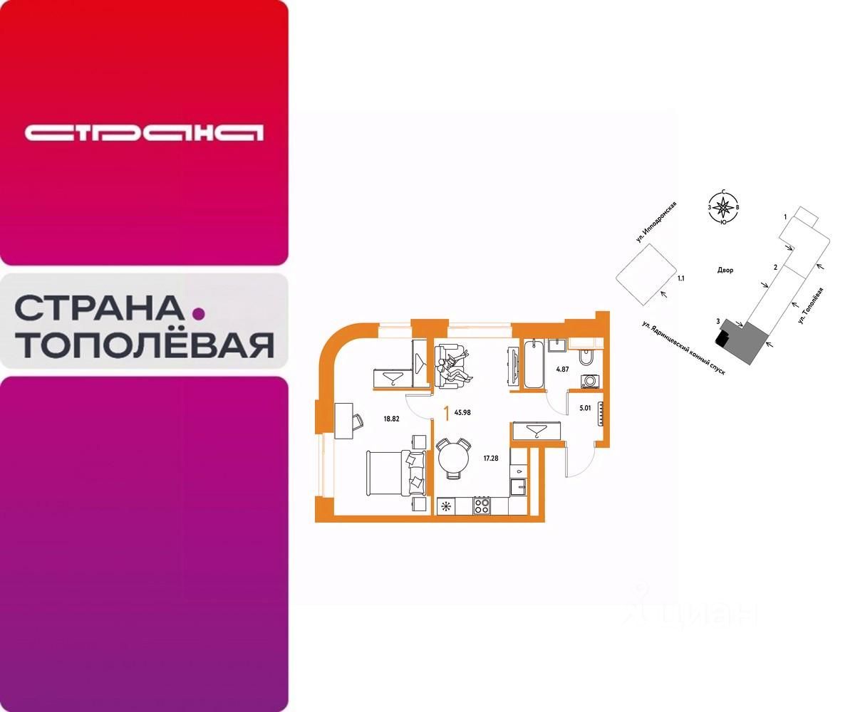 Продается 1комнатная квартира на 2 этаже от застройщика Страна Девелопмент. Площадь квартиры 45.98 кв. м.