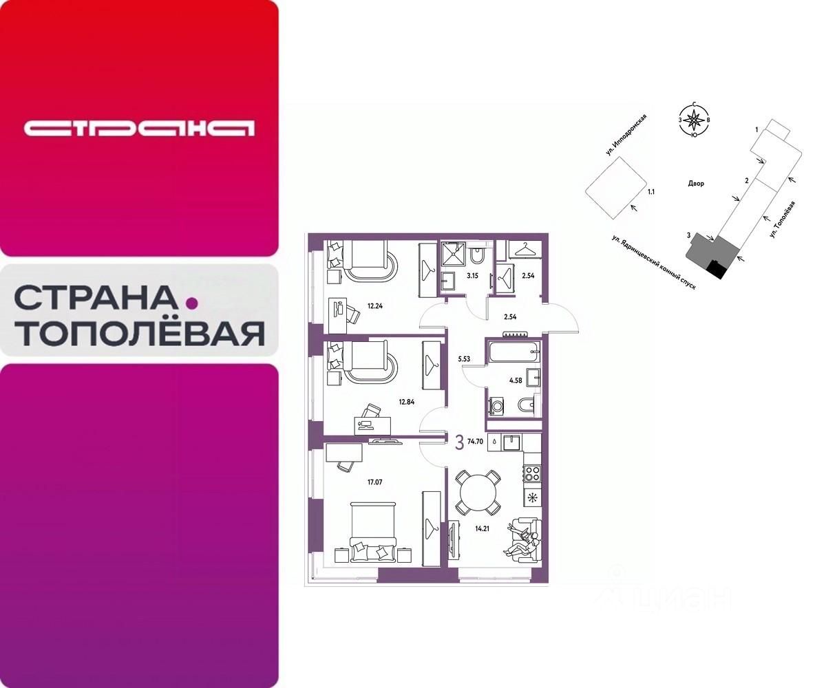 Продается 3комнатная квартира на 3 этаже от застройщика Страна Девелопмент. Площадь квартиры 74.7 кв. м.