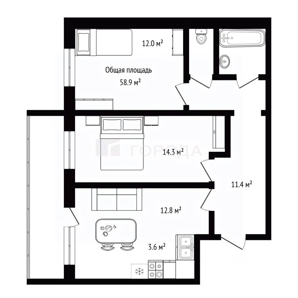 Общая площадь — 58,9 м² (с лоджией — 65 м²)