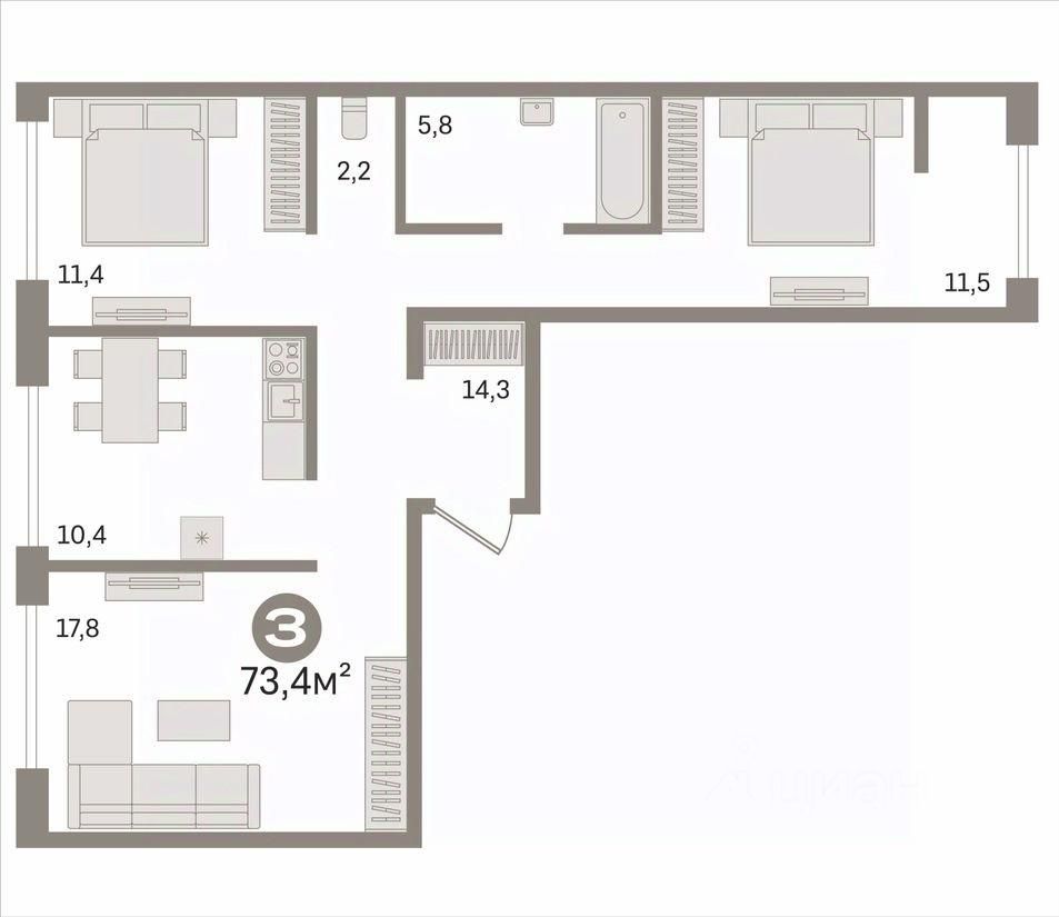 В продаже трехкомнатная квартира площадью 73,4 кв.м.
