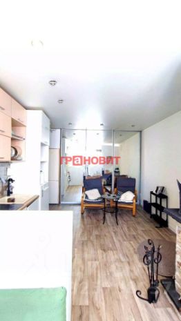 Кухня-гостиная с отдельной обеденной зоной и зоной отдыха, кухонная мебель (с встроенной духовкой и варочный поверхностью), вместительный, встроенный зеркальный шкаф, холодильник, диванчик.