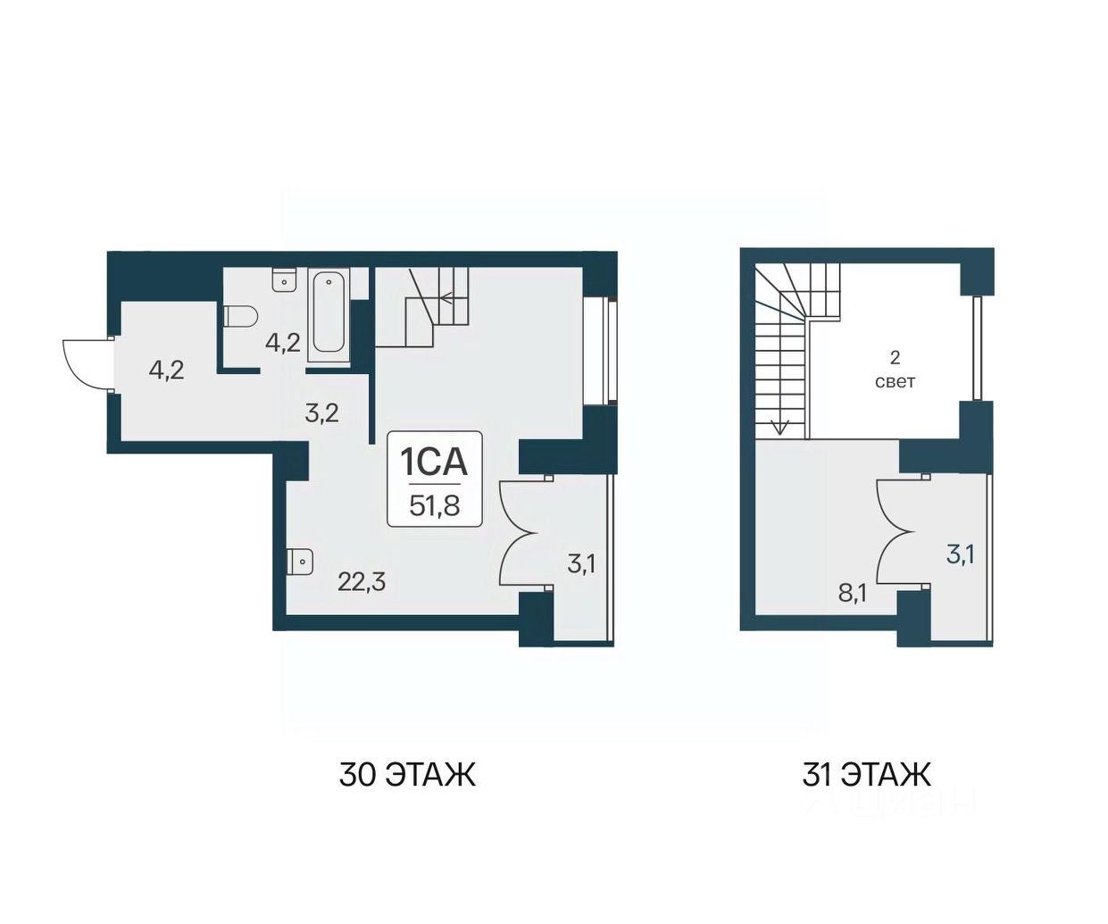 Продаётся 1-комнатная квартира в строящемся доме (Дом 5), срок сдачи: II-кв. 2026, общей площадью 51.8 кв.м., на 30 этаже.