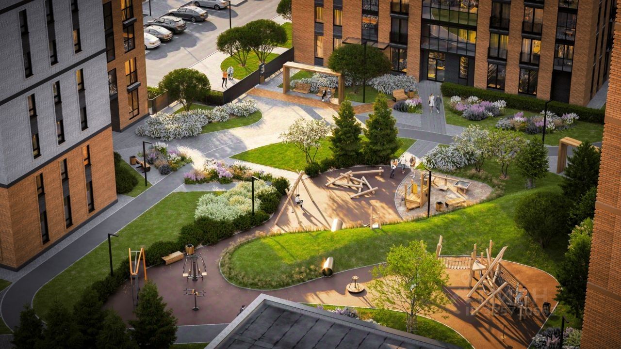 На внутреннем периметре размещаются развивающие детские игровые зоны и спортивные площадки на бесшовном резиновом покрытии, а также места для отдыха взрослых. Озеленение проводится в виде посадки кустарников, газонов и цветников.