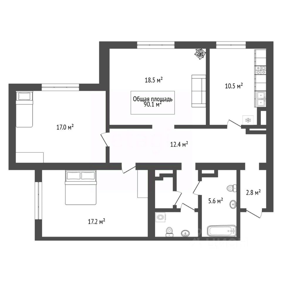 Общая площадь: 90,1 м²
