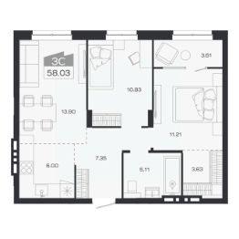 Продаётся 3-комнатная квартира в строящемся доме (Дом 2), срок сдачи: III-кв. 2026, общей площадью 58.03 кв.м., на 5 этаже. Новый жилой комплекс "Базилик" от застройщика "Группа Мета" расположен в рп. Краснообск Новосибирской области на ул. Восточная.