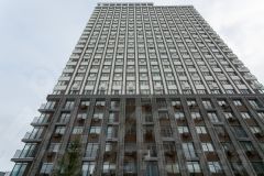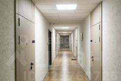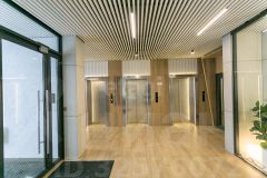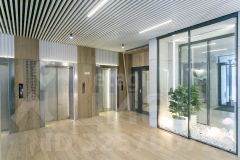 Просторное лобби для ожидания на первом этаже, закрытая колясочная и парковка для велосипедов.