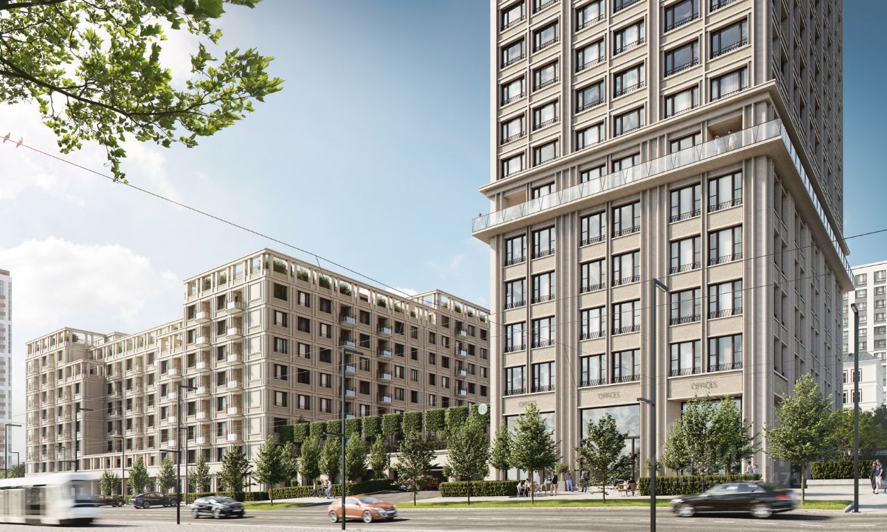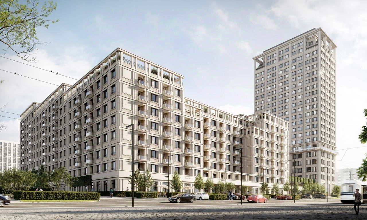 Архитектурная концепция комплекса— современные кварталы европейского города. Решение фасадов основано на сочетании классического кирпича и светлой штукатурки. В строительстве и внутренней отделке дома используются самые качественные и натуральные материалы, изготовленные по новейшим технологиям. В доме есть 2-хуровневый подземный паркинг с автоматическими воротами, доступ к которому осуществляется через лифт с жилых этажей без необходимости выходить на улицу. На первом этаже по внешнему периметру комплекса располагается торгово-офисная галерея с отдельным входом, на верхних этажах пентхаусы — просторные квартиры свободной планировки с террасой, откуда открывается великолепный вид на реку, левобережную и центральную части города. Входной тамбур с вестибюлем выполнен из двойных прозрачных входных групп. На первом этаже есть колясочная, комната охраны, холл. В доме предусмотрена установка лифтовой системы пониженным уровнем шума.