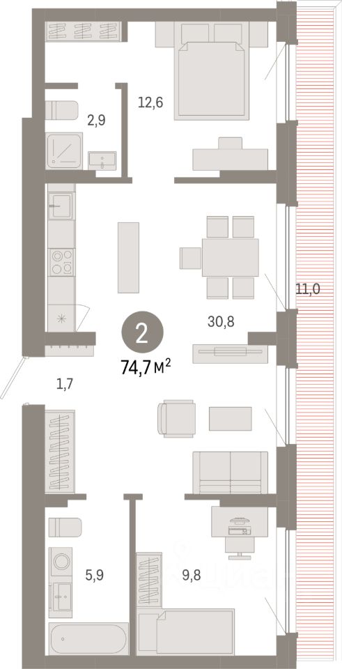 Продаётся 2-комнатная квартира в строящемся доме (Дом 1), срок сдачи: II-кв. 2028, общей площадью 74.7 кв.м., на 8 этаже. "Квартал Лебедевского" - новый проект компании "Брусника" в Заельцовском районе Новосибирска на ул. Георгия Колонды.