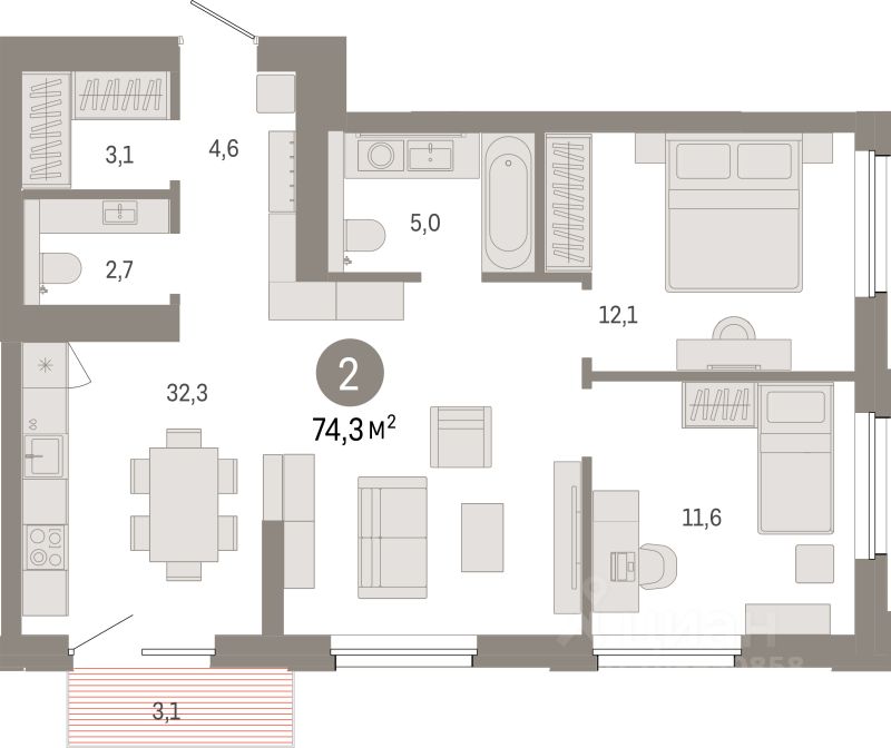 74,3 м²