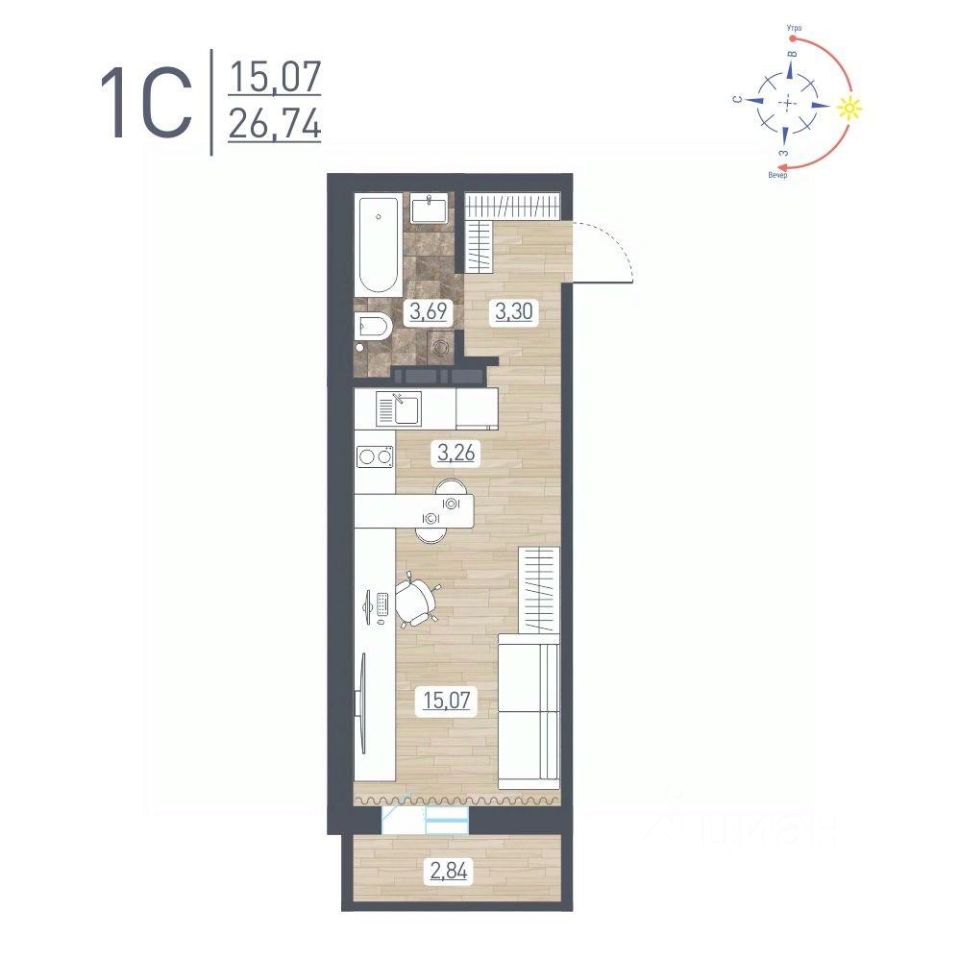 Продаётся студия в сданном доме (Забалуева, 69/2 (Дом 11)), срок сдачи: IV-кв. 2025, общей площадью 26.74 кв.м., на 16 этаже. Расположение, транспортная доступность