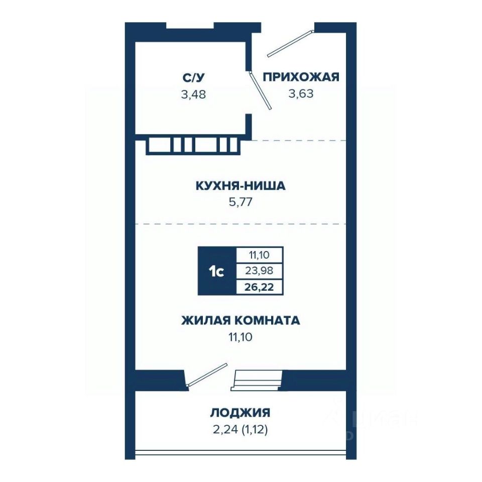 Продаётся студия в строящемся доме (ГП-1, БС 1,2), срок сдачи: III-кв. 2026, общей площадью 26.22 кв.м., на 17 этаже.