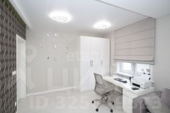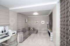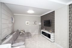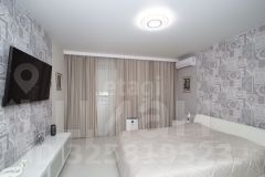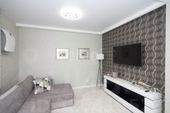 - Большая комната - гостиная, два окна. На потолке натяжные потолки, на стенах флизелиновые обои, на полу плитка ПВХ. Большой новый диван и тв-зона, зона для работы. Также установлена система очистки воздуха ("Тион")