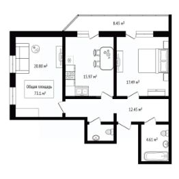 Квартира с большой кухней-гостиной (16 кв.м) и двумя комнатами (20 и 17 кв.м).