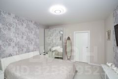 В спальне дорогая новая кровать с ортопедическим матрасом, две тумбочки, гардеробный шкаф с зеркальными дверями. Также тумба для ТВ, установлен телевизор напротив кровати. В комнате натяжной потолок, флизелиновые обои.