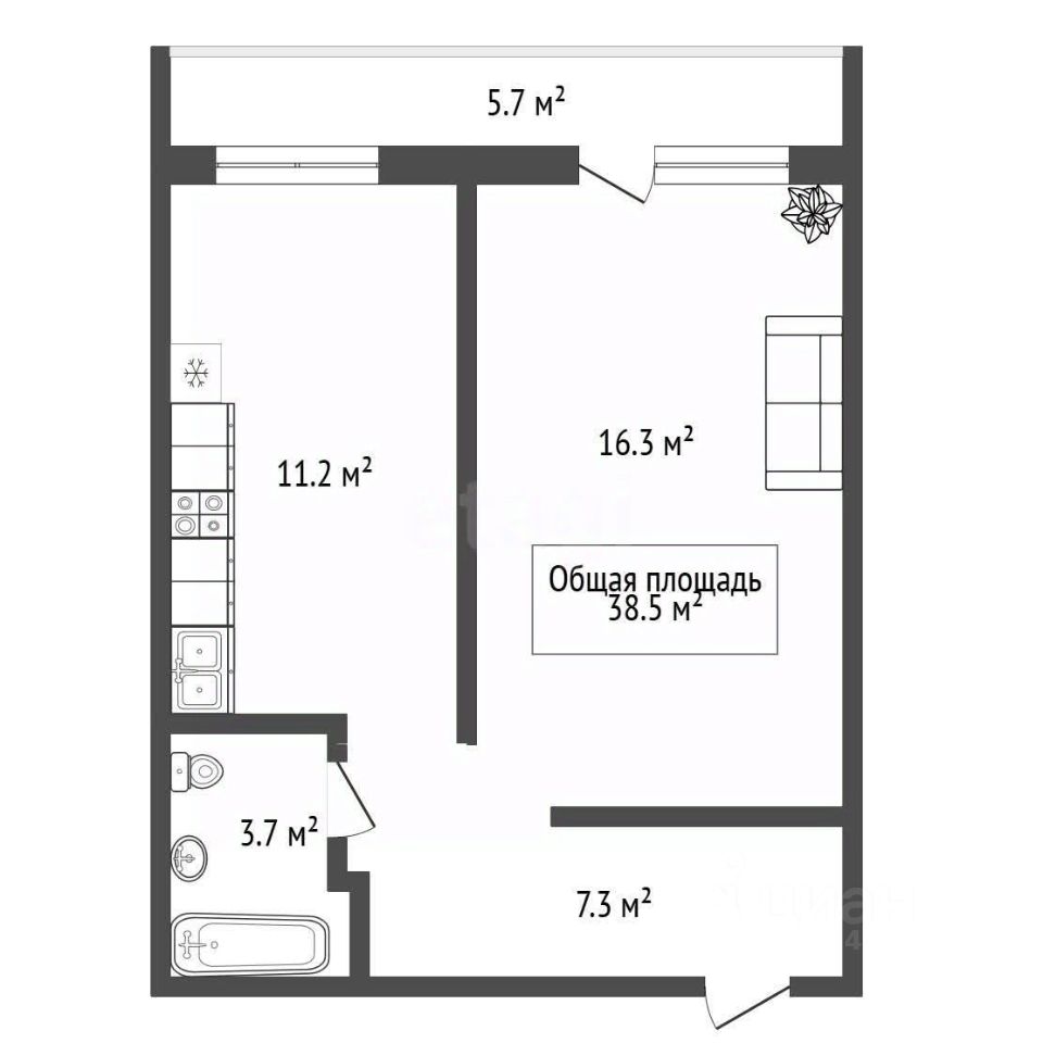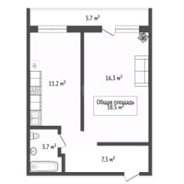 Общая площадь — 39 м², кухня - 11.2 м², жилая площадь: 16.3 м², большaя лоджия - 5,7 м² ,высота потолков - 2,5 м, санузел совмещенный.
