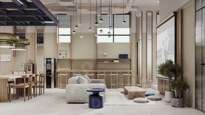 Здания объединяет стилобат — общее пространство лобби с ресепшен, соседским центром для работы, развлечений и мероприятий, магазинами и другой инфраструктурой в формате "тапочной" доступности, без необходимости покидать комплекс. Здесь же колясочные, санитарные комнаты, лапомойка. Для жителей предусмотрены подземный паркинг с сервис-станцией и кладовые для хранения сезонных вещей.