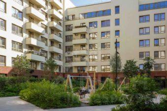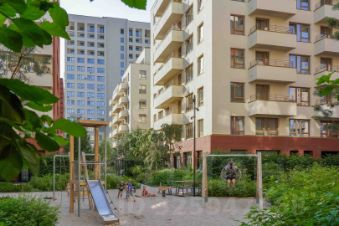 Дворы в "Европейском береге" закрыты от машин и представляют собой зелёный сад со спортивными и детскими площадками, местами для отдыха жителей. Работают два детских сада, две общеобразовательных школы со стадионом.