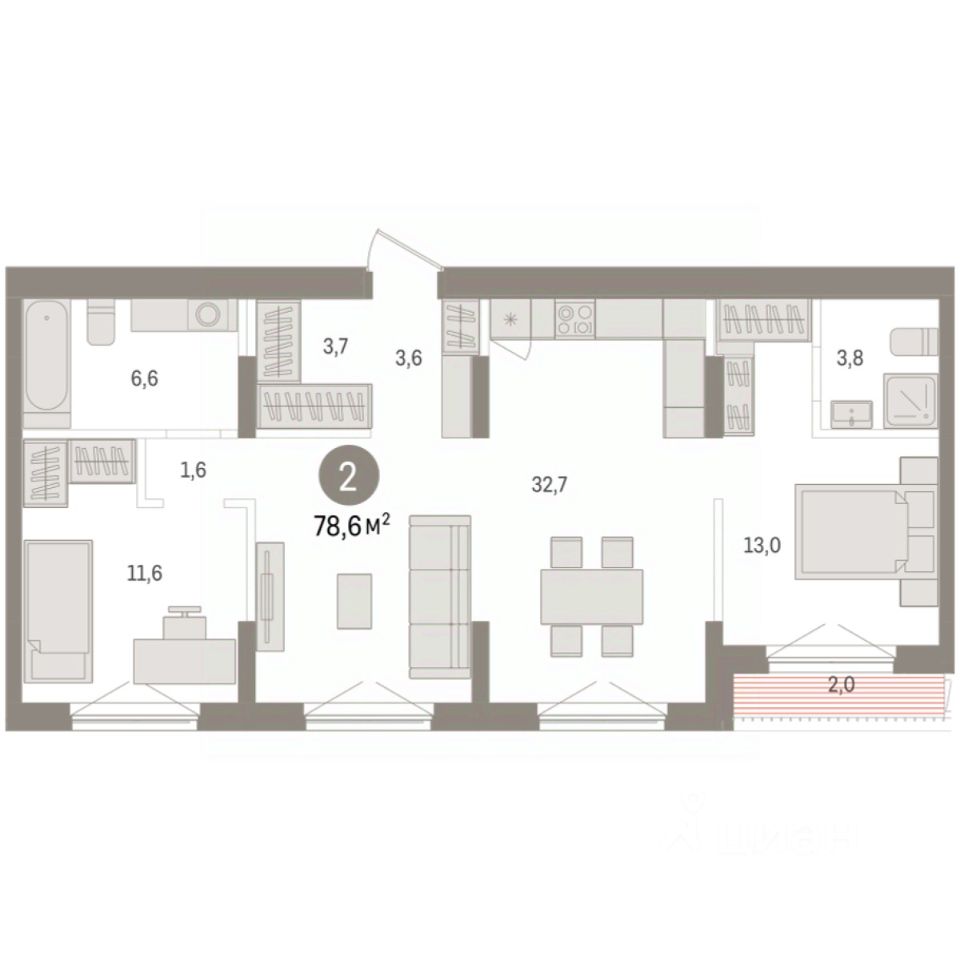 Квартира с кухней-гостиной и двумя спальнями в квартале Авиатор. Особенности планировки: разнесённые спальни, свободная планировка, терраса на крыше.