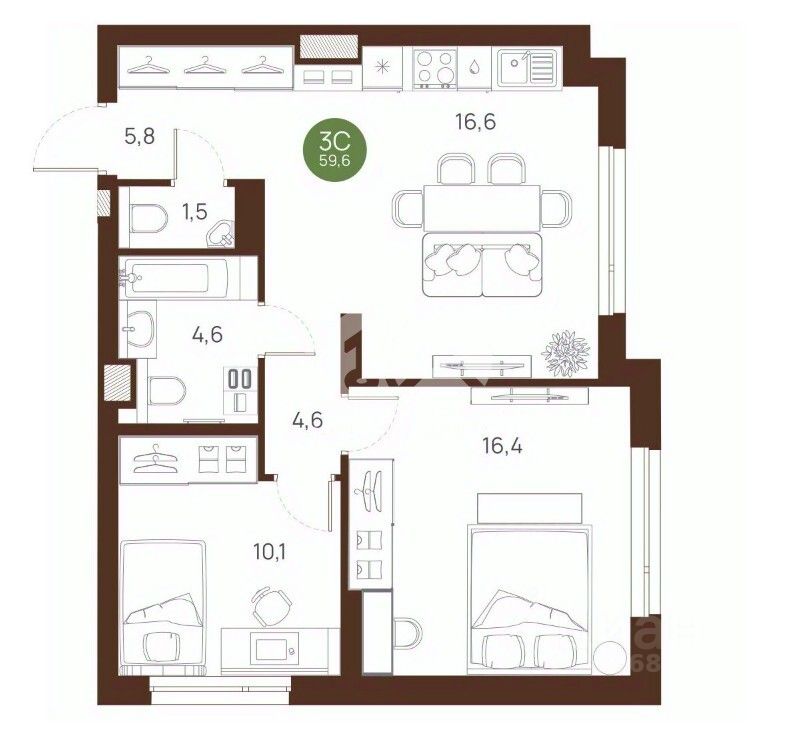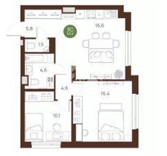 Планировка включает две изолированные комнаты, площадь которых составляет 10,1 кв. м и 16,4 кв. м, а также кухню площадью 16,6 кв. м. Окна выходят на улицу. В квартире есть один раздельный и один совмещённый санузел.