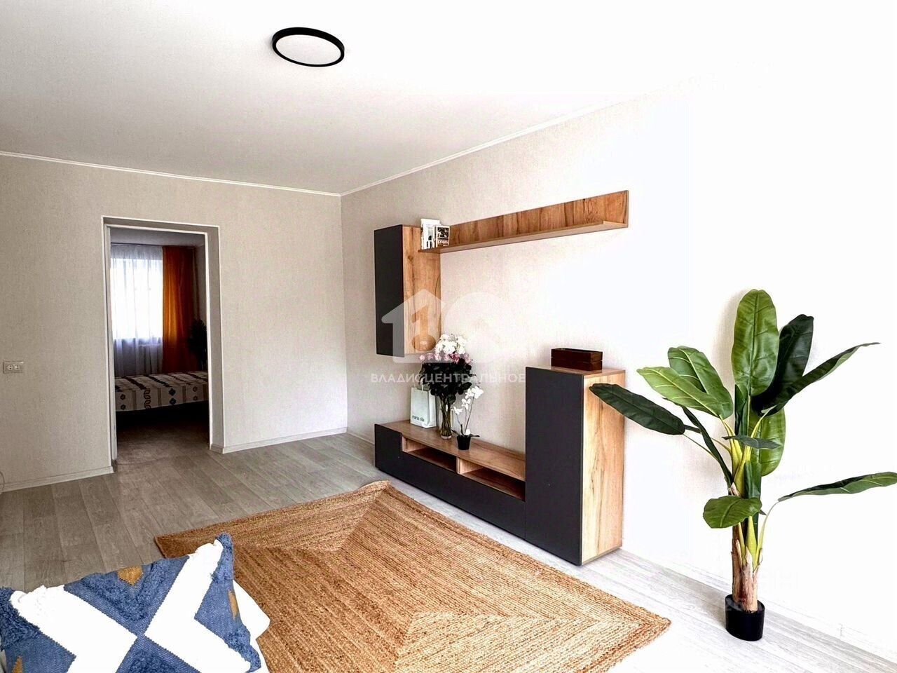 В гостиной диван и тумба под телевизор.