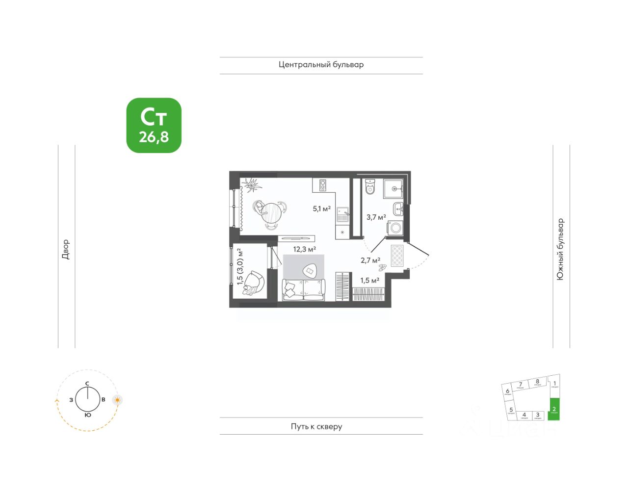 Санузел оборудован душевой и местом под стиральную машину, что обеспечивает практичность и удобство в повседневной жизни