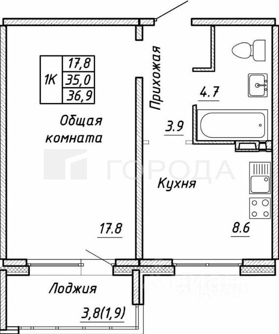 Общая площадь квартиры — 34,7 кв. м, высота потолков — 2,7 метра.