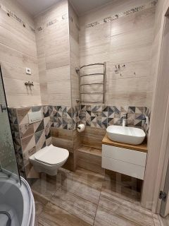Продается уютная и современная квартира с продуманным дизайном интерьера. В ванной комнате преобладают светлые тона, создающие ощущение простора и чистоты. Стены облицованы плиткой под дерево, что добавляет теплоты и уюта. Ванная комната оборудована всем необходимым: раковина с зеркалом, унитаз, душевая кабина и полотенцесушитель. Пол выложен плиткой под дерево, что гармонирует с общим стилем помещения.