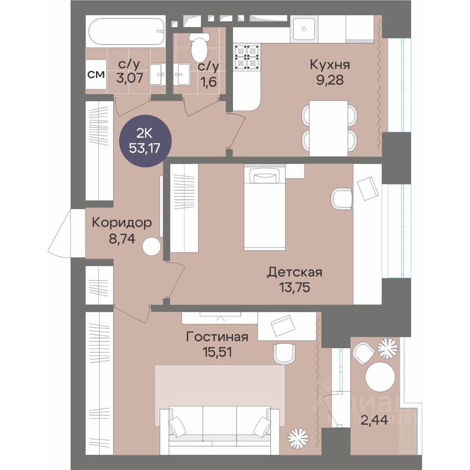 Общая площадь53,17 м²