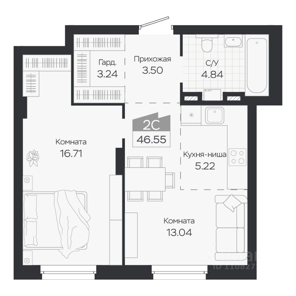 Продаётся 2-комнатная квартира в строящемся доме (Дом 3), срок сдачи: IV-кв. 2027, общей площадью 46.55 кв.м., на 2 этаже. Новый жилой комплекс "Базилик" от застройщика "Группа Мета" расположен в рп. Краснообск Новосибирской области на ул. Восточная.