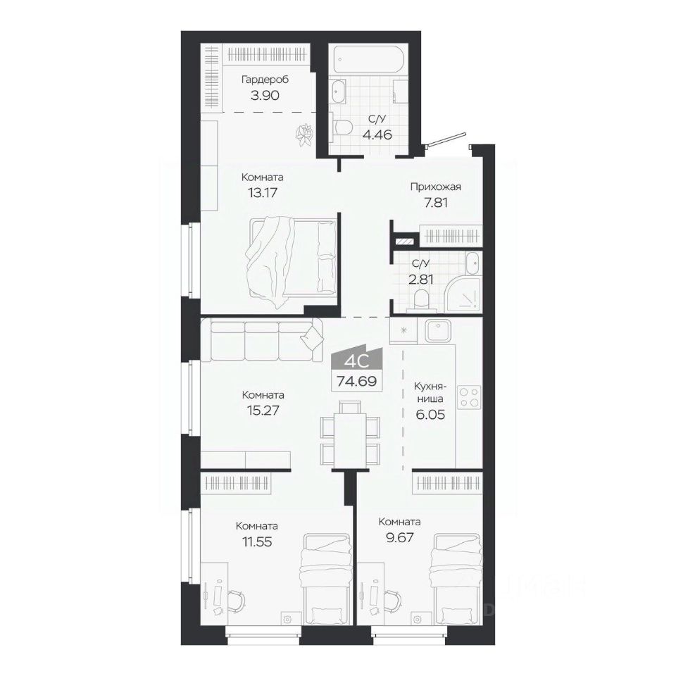 Продаётся 4-комнатная квартира в строящемся доме (Дом 3), срок сдачи: IV-кв. 2027, общей площадью 74.69 кв.м., на 2 этаже. Новый жилой комплекс "Базилик" от застройщика "Группа Мета" расположен в рп. Краснообск Новосибирской области на ул. Восточная.