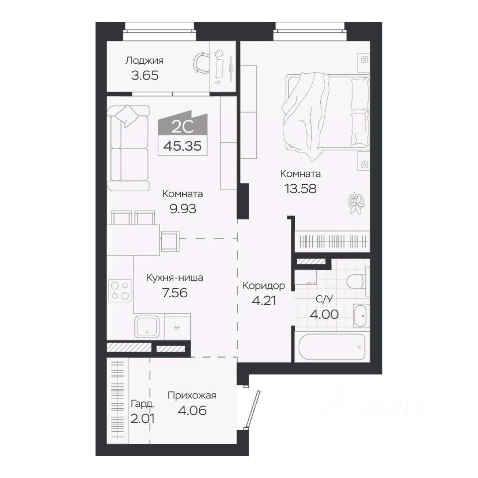 Продаётся 2-комнатная квартира в строящемся доме (Дом 3), срок сдачи: IV-кв. 2027, общей площадью 45.35 кв.м., на 6 этаже. Новый жилой комплекс "Базилик" от застройщика "Группа Мета" расположен в рп. Краснообск Новосибирской области на ул. Восточная.