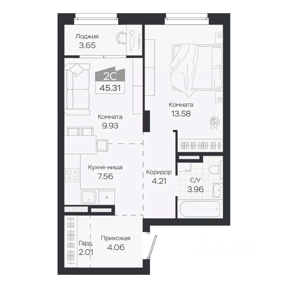 Продаётся 2-комнатная квартира в строящемся доме (Дом 3), срок сдачи: IV-кв. 2027, общей площадью 45.31 кв.м., на 7 этаже. Новый жилой комплекс "Базилик" от застройщика "Группа Мета" расположен в рп. Краснообск Новосибирской области на ул. Восточная.