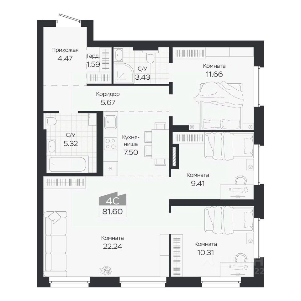 Продаётся 4-комнатная квартира в строящемся доме (Дом 3), срок сдачи: IV-кв. 2027, общей площадью 81.6 кв.м., на 7 этаже. Новый жилой комплекс "Базилик" от застройщика "Группа Мета" расположен в рп. Краснообск Новосибирской области на ул. Восточная.