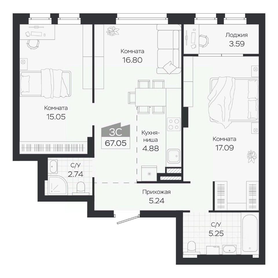 Продаётся 3-комнатная квартира в строящемся доме (Дом 3), срок сдачи: IV-кв. 2027, общей площадью 67.05 кв.м., на 7 этаже. Новый жилой комплекс "Базилик" от застройщика "Группа Мета" расположен в рп. Краснообск Новосибирской области на ул. Восточная.