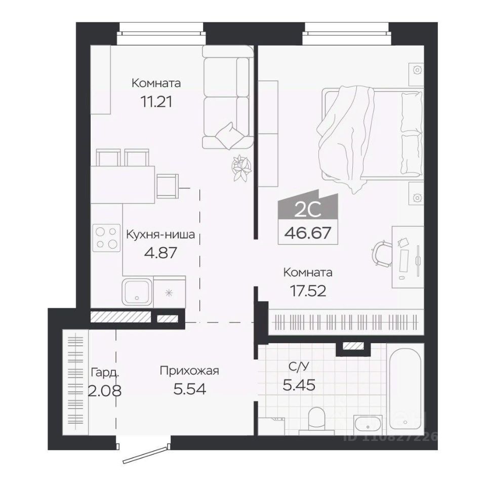 Продаётся 2-комнатная квартира в строящемся доме (Дом 3), срок сдачи: IV-кв. 2027, общей площадью 46.67 кв.м., на 2 этаже. Новый жилой комплекс "Базилик" от застройщика "Группа Мета" расположен в рп. Краснообск Новосибирской области на ул. Восточная.
