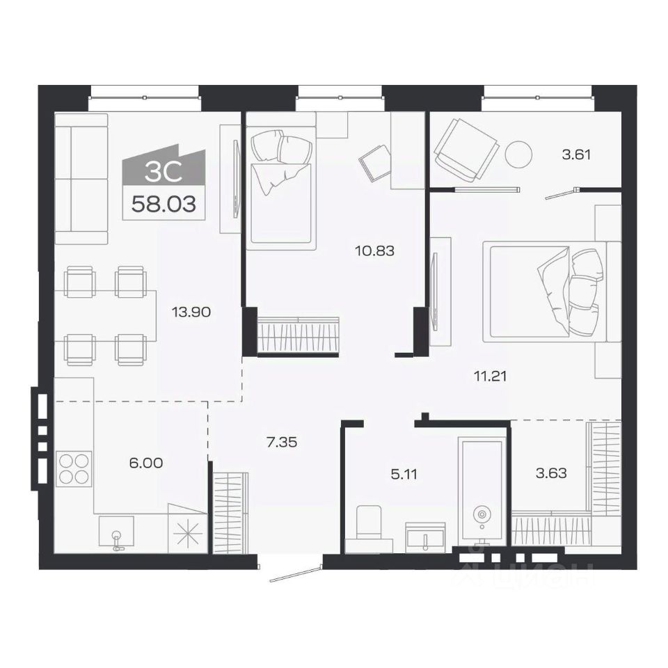 Продаётся 3-комнатная квартира в строящемся доме (Дом 2), срок сдачи: III-кв. 2026, общей площадью 58.03 кв.м., на 5 этаже. Новый жилой комплекс "Базилик" от застройщика "Группа Мета" расположен в рп. Краснообск Новосибирской области на ул. Восточная.